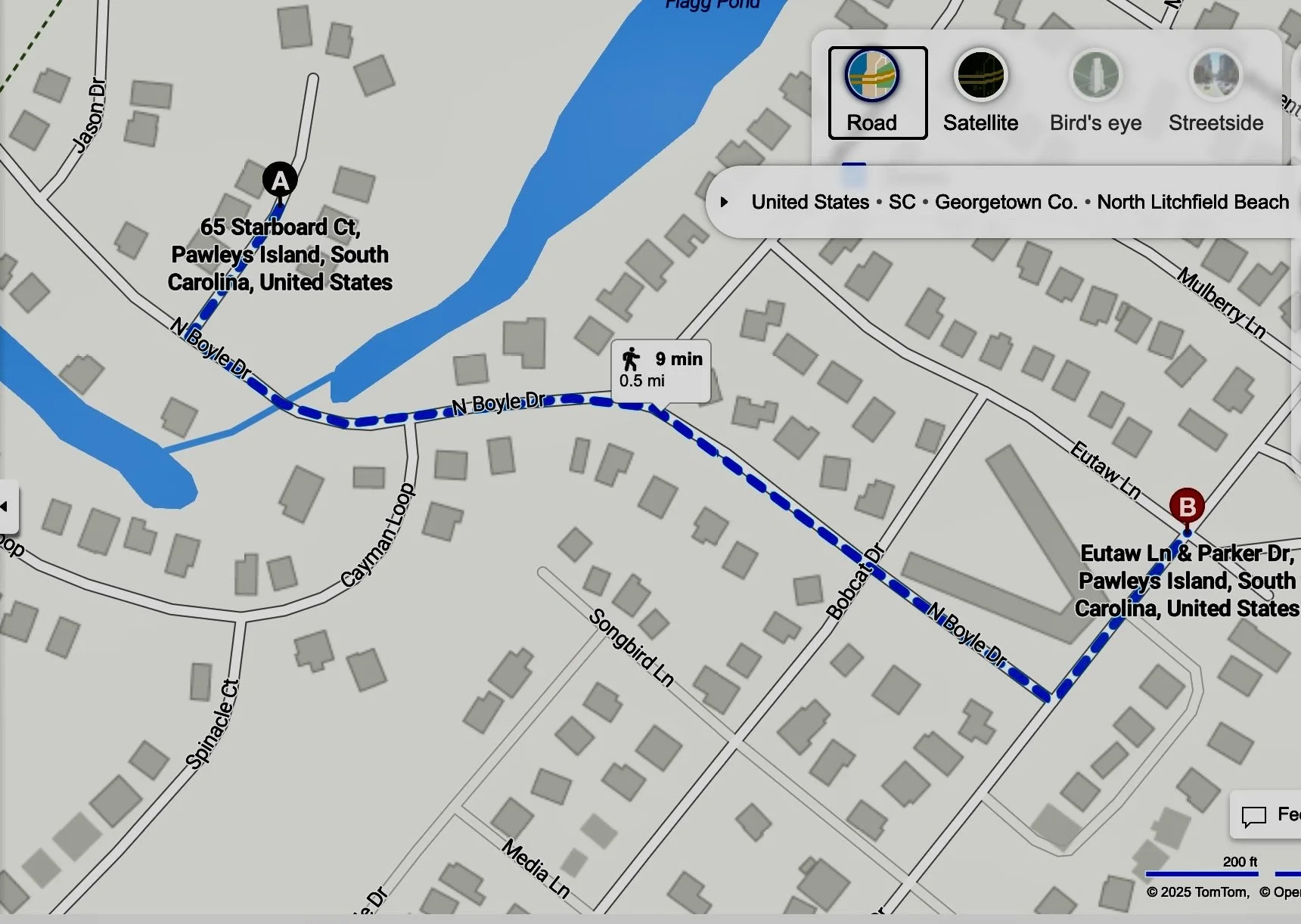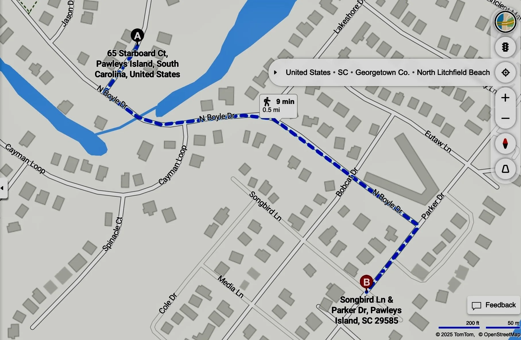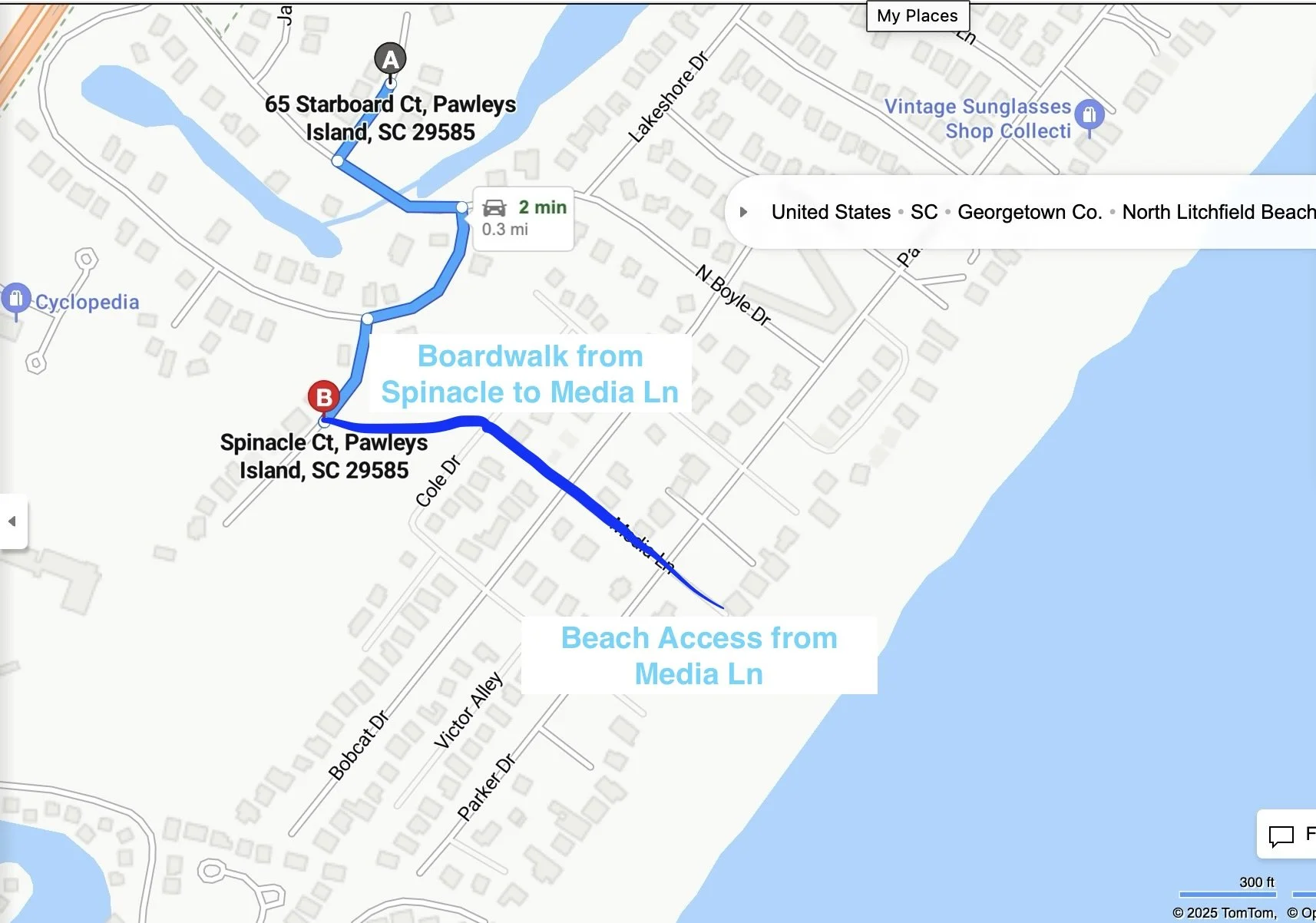 Access # 57, 248 Parker Dr. If you are biking or walking, this boardwalk route has less traffic and some lovely marsh scenery. It runs from Spinacle Ct to Media Ln, and the beach access is at Media and Parker.